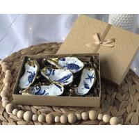 Our journey begins along the shores of North Carolina's beaches, where our oyster shells are handpicked with care. Back at the workshop the meticulous process of decoupage begins. Delicate design is applied to each oyster shell and to accentuate the beauty of each ornament, the edges are delicately hand-painted. Each shell is then decorated with wooden beads and nestled with care into an elegant gift box, ensuring that the unwrapping experience is as delightful as the gift itself.